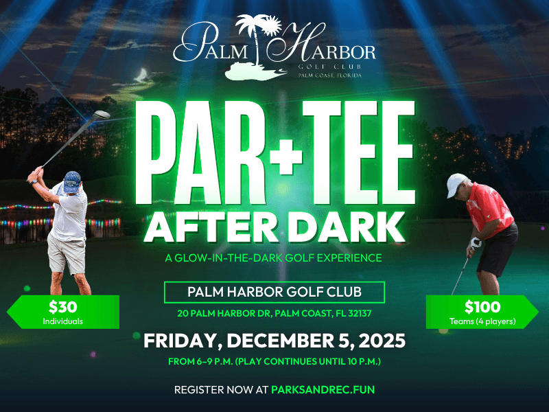The City of Palm Coast invites residents and visitors to light up the night at “Par-Tee After Dark,” a glow-in-the-dark golf experience at the Palm Harbor Golf Club. The event is scheduled for Friday, December 5, 2025, from 6–9 p.m., with play continuing until 10 p.m.