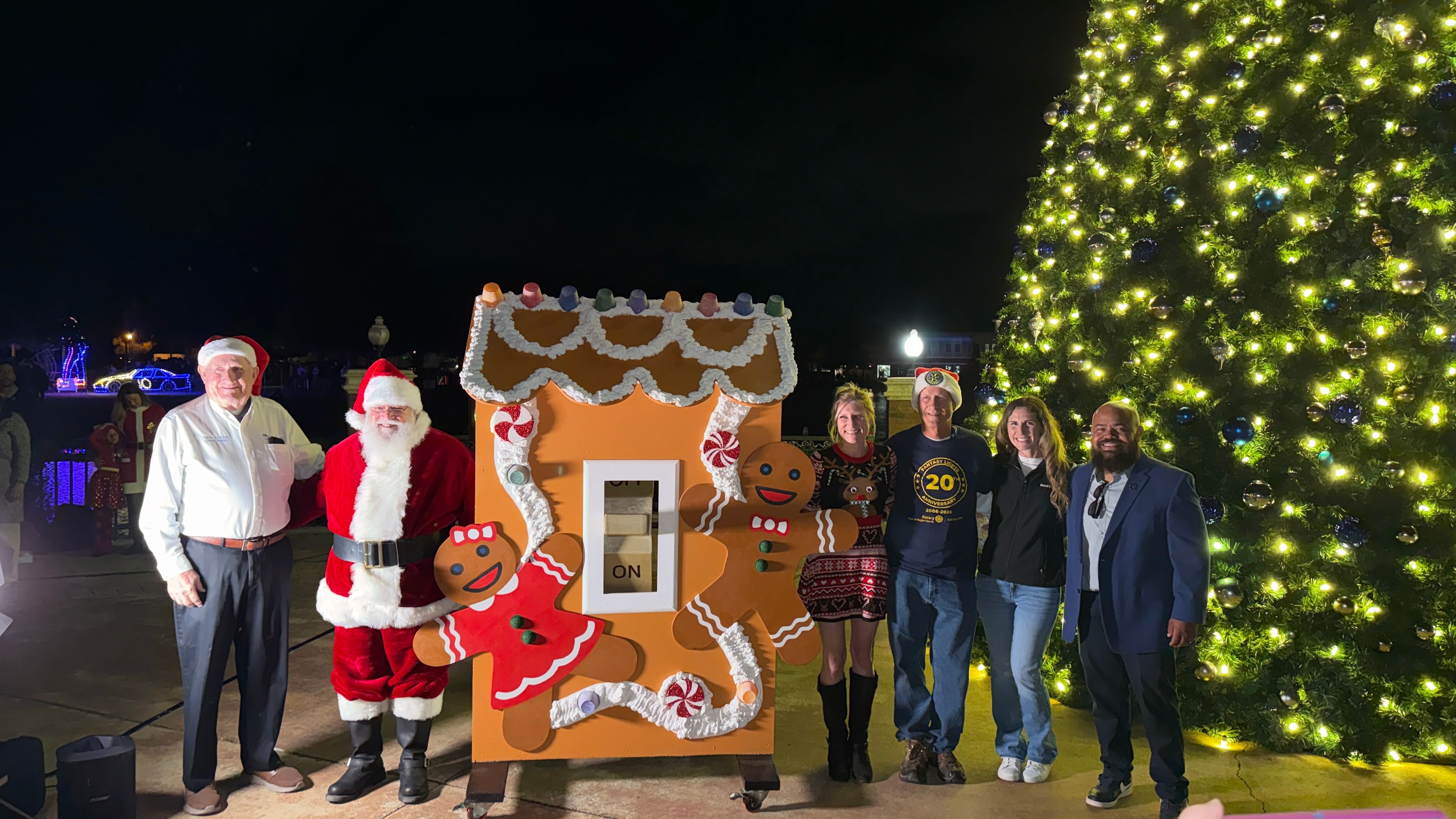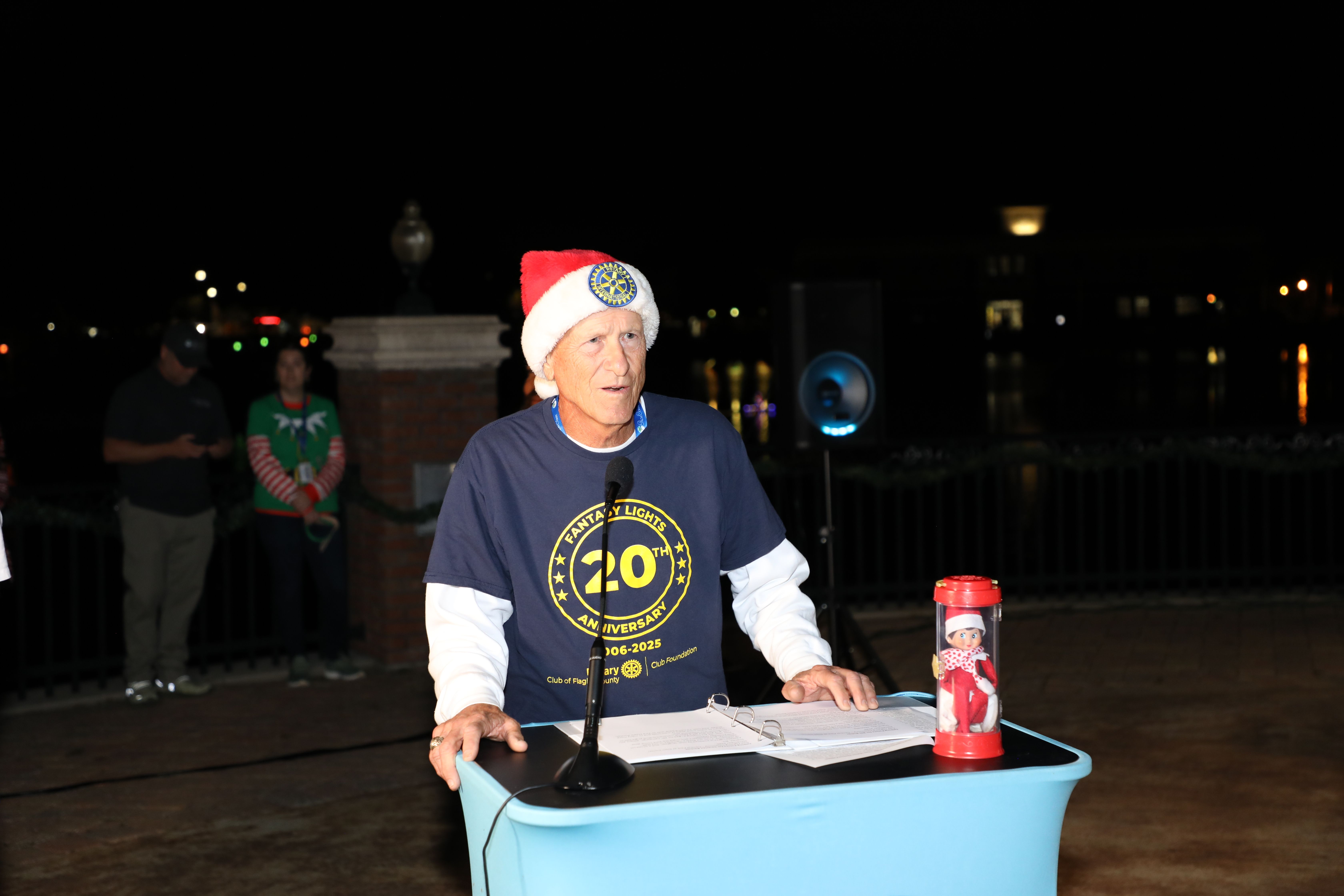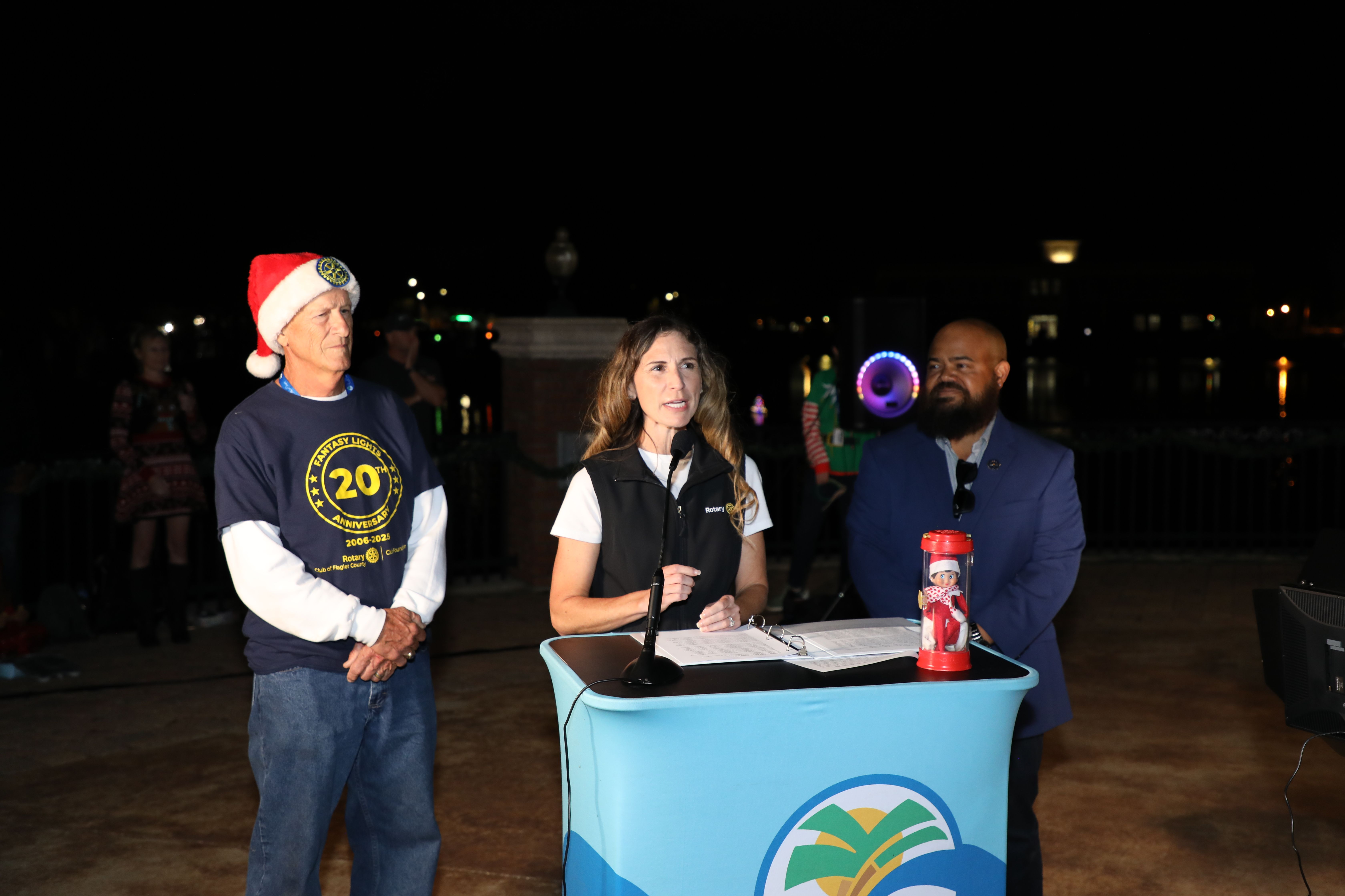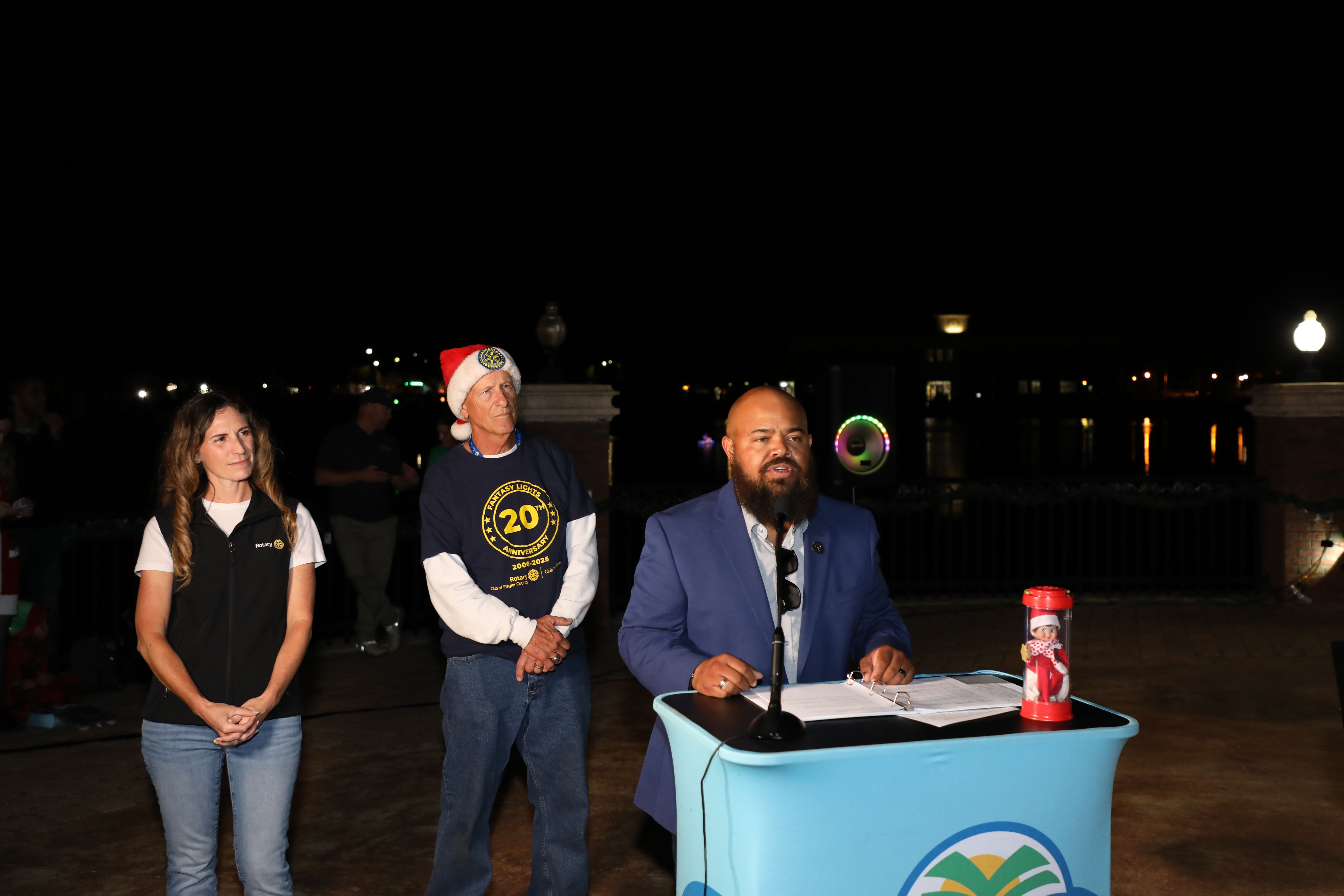 The ceremony also honored a significant milestone—20 years of the Rotary Club of Flagler County’s Fantasy Lights Festival. Rotary representatives Charles Barbel, Michelle Bartlome, and Bill Butler addressed the crowd, highlighting the festival’s origins, its more than 36,000 volunteer hours, and its lasting impact on local students, nonprofits, and service projects. Their remarks underscored the deep partnership between the Rotary Club and the City of Palm Coast in bringing this beloved event to life each year.